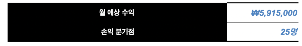 손익분기점이란? 매출액과 비용(고정비+변동비)이 일치하는 지점을 의미합니다. 즉, 몇 명의 회원이 등록해야 요가원에 수익이 나는지를 알 수 있는 지표랍니다. 샘플 양식에서 손익 분기점은 회원이 25명이 되는 시점이네요.