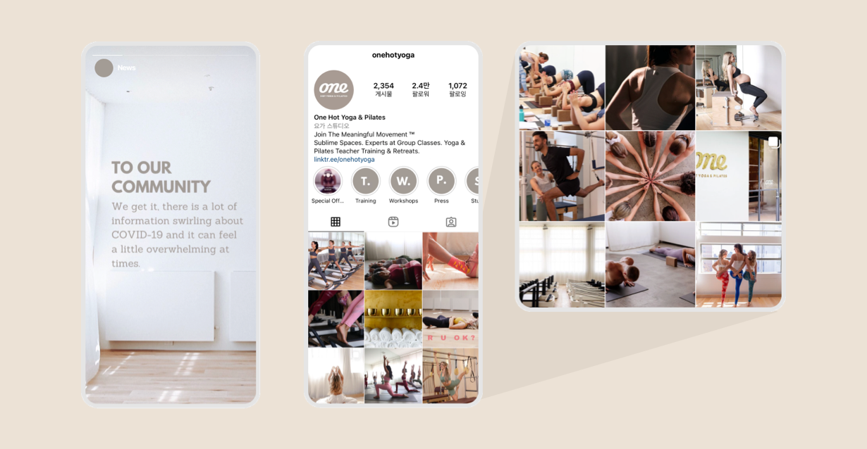 원 핫 요가 앤 필라테스는 SNS 계정도 인테리어와 일관된 느낌으로 운영하고 있습니다. 브랜드 로고가 새겨진 운동 소도구뿐 아니라 오일이나 와인 등의 제품도 제작하며 자연스럽게 회원들의 일상에 스며들고 있습니다.